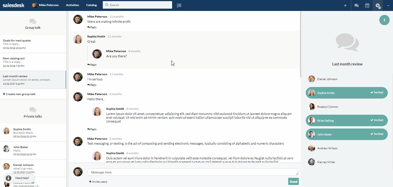 Use the CRM as a communication platform for your business. Create public and private ducussions to plan the next big move or talk about last meeting. All messages will be saved and made searchable to relevant employees.